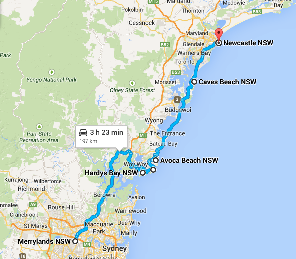So this was it, we were leaving Sydney and heading towards Newcastle with not much more to guide us than a Lonely Planet book from 2009, which we’d had for a while but only just started using. I got into the habit of reading a few pages ahead as we went so if there was anything of interest, we wouldn’t miss it. But mainly what we were interested in was finding good surf beaches!